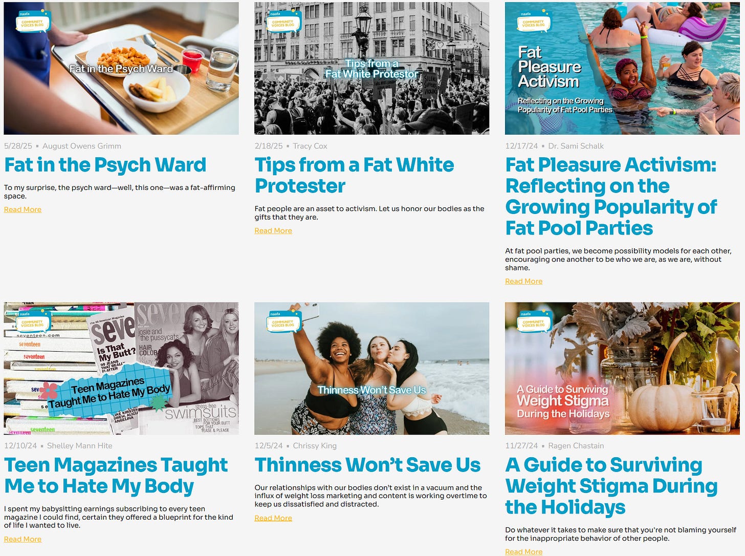 The largest and longest-running organization pursuing this goal is NAAFA (the National Association for the Advance of Fat Acceptance). Their home page welcomes visitors with a short pitch:4