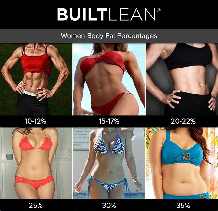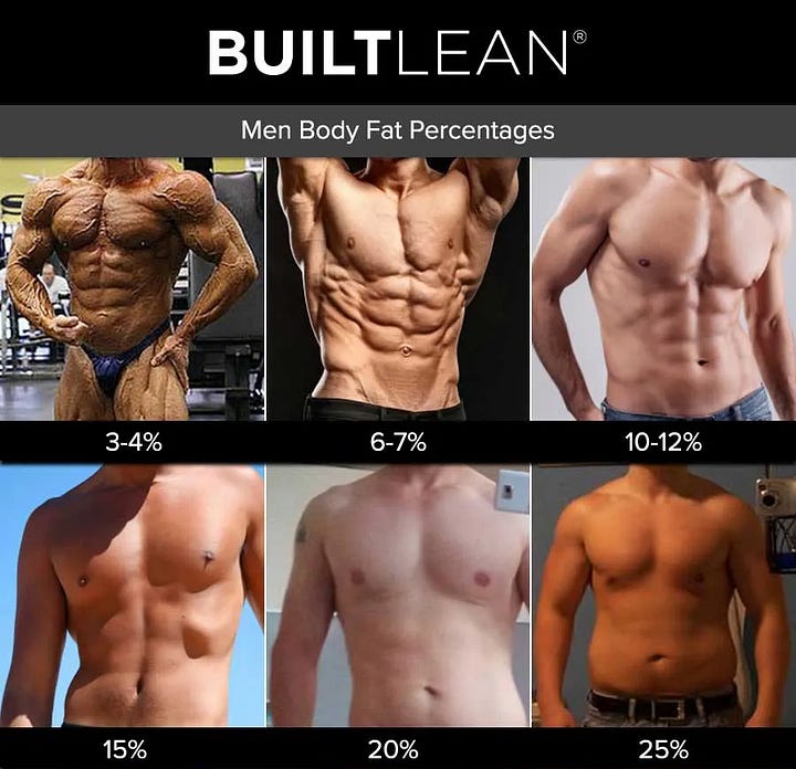 Today’s beauty standards for ‘jacked’ tends to fall somewhere around 12% for men and 20% for women- just making it into the ‘athletes’ category. Most amateur fitness enthusiasts dramatically overestimate how lean they actually are. At 12% body fat for men, you should be seeing:11